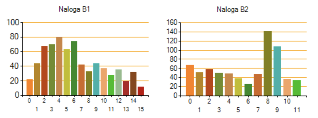 Porazdelitvi osmošolcev po doseženih točkah pri B nalogah pa sta taki: