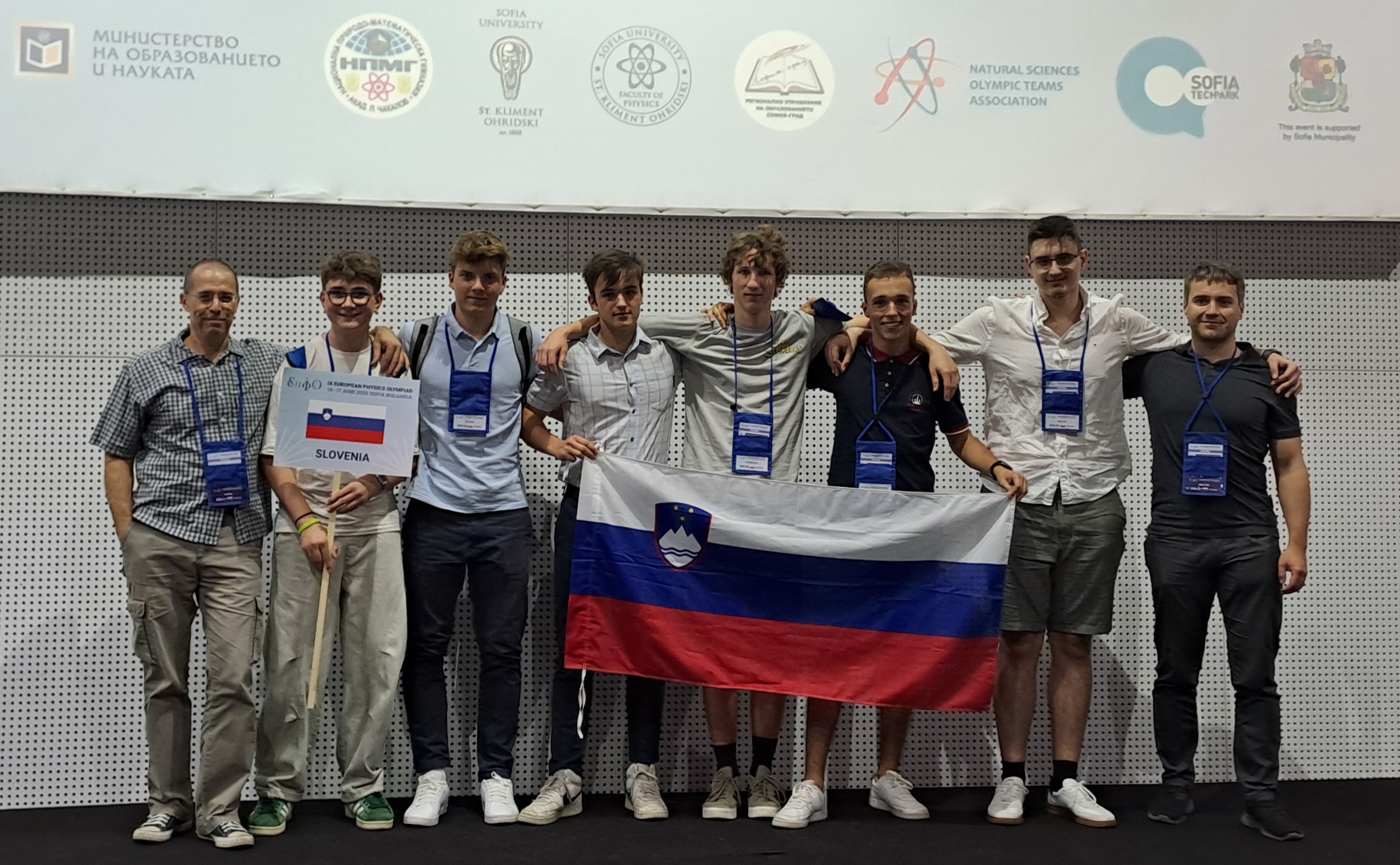 Slovenska ekipa se je v torek, 17. 6. 2025, vrnila iz 9. Evropske fizikalne olimpijade v Sofiji v Bolgariji. Naši tekmovalci so se ponovno odlično odrezali. Svit Miklavčič (Gimnazija Vič, Ljubljana), Enej Jauk in Žan Arsov (oba Gimnazija Bežigrad) so osvojili srebrne medalje in se s tem uvrstili med najboljših 45 od skupaj 189 tekmovalcev iz 40 držav (30 evropskih in 10 gostujočih). Uspeh je s pohvalo dopolnil Aleksander Jotanović (Šolski center Novo mesto), olimpijade pa se je udeležil tudi Žiga Vučajnk (I. gimnazija v Celju). Slovenske tekmovalce sva spremljala Mitja Zidar in Jurij Bajc.