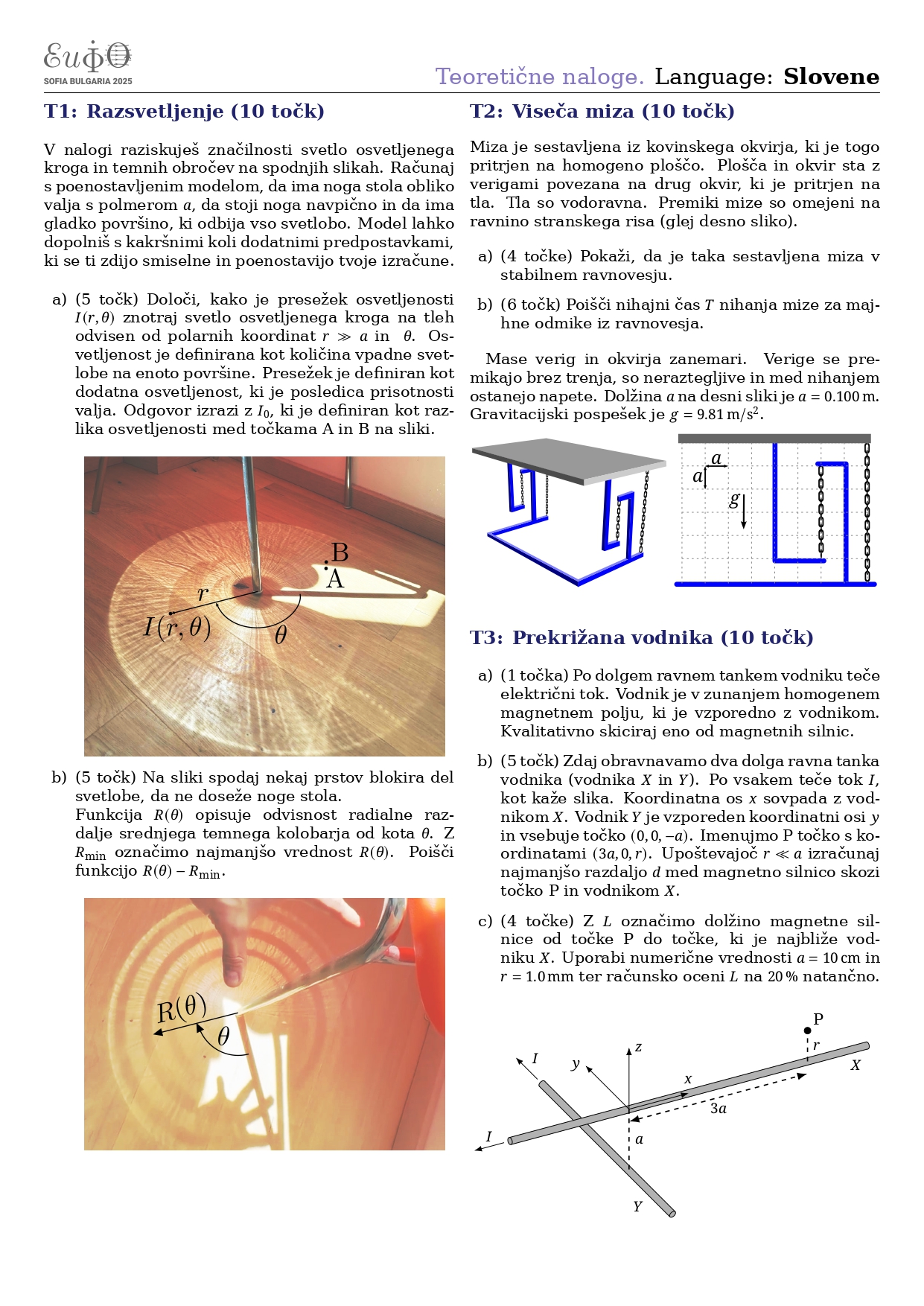Posebnost olimpijade so problemi oziroma naloge, ki izhajajo iz realističnih raziskovalnih situacij. Tekmovalci so naloge reševali dva dni po 5h. Prvi dan so reševali 2 eksperimentalni nalogi. Prva naloga z naslovom Globoko učenje je zahtevala raziskovanje fizikalnega modela nevrona in usposabljanje nevronske mreže z uporabo danih vezij in merilnih naprav. Druga naloga Skriti vzorec pa je zahtevala merjenje in fizikalni opis z očesom nevidnega mikrovzorca na polprosojni foliji. Drugi dan so tekmovalci reševali 3 teoretične naloge različnih zahtevnosti, z naslovi Razsvetljenje, Viseča miza in Prekrižana vodnika. Med slovenskimi tekmovalci je največ točk dosegel Svit Miklavčič, ki je osvojil 16,4 točke za teoretični in 8,4 točke za eksperimentani del.