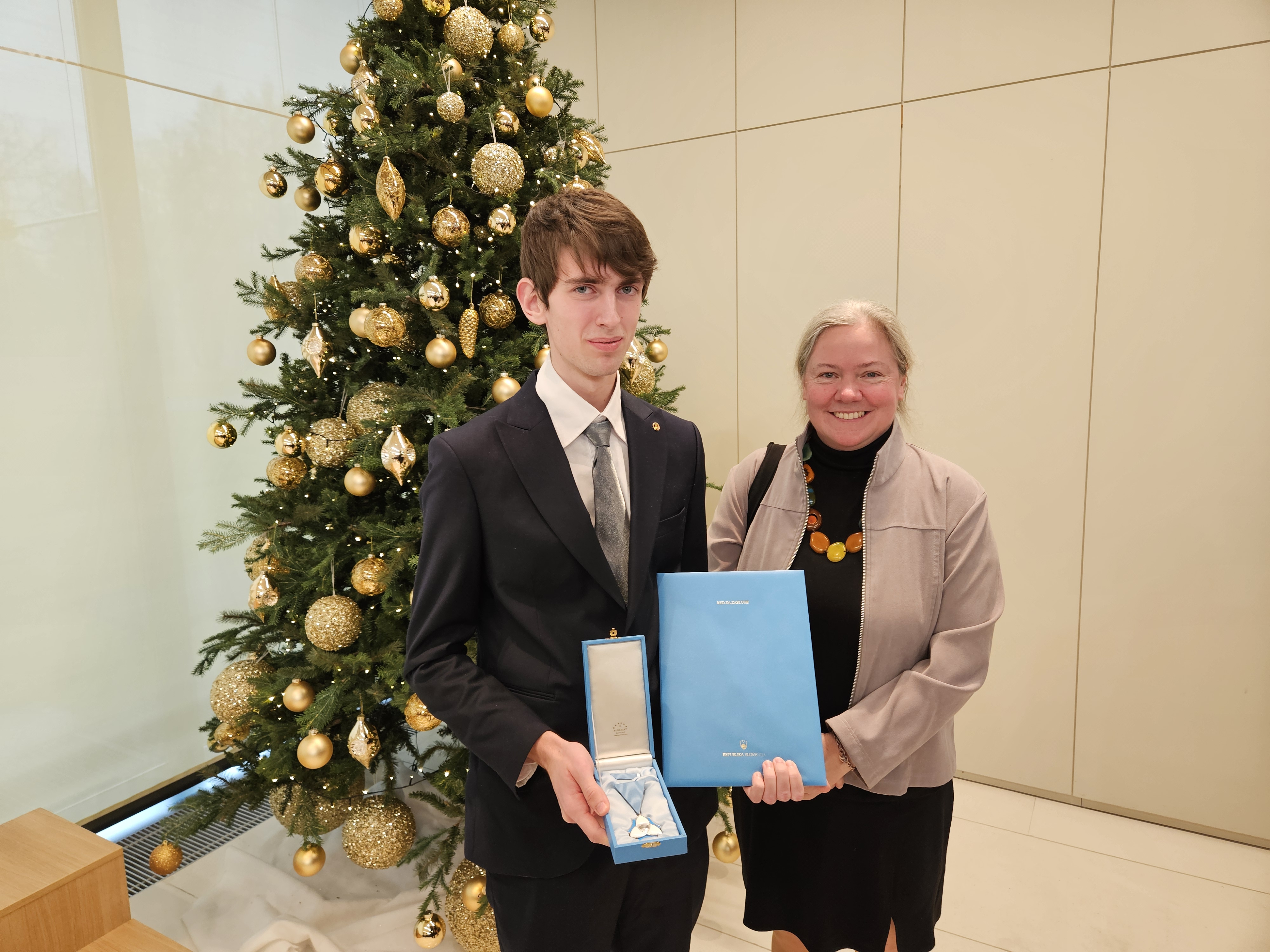 Predsednica Republike Slovenije Nataša Pirc Musar je pred Dnevom samostojnosti in enotnosti na Brdu pri Kranju podelila najvišja odlikovanja države za izjemne zasluge in dejanja posebnega pomena za blaginjo Slovenije. Prejelo jih je 25 prejemnic in prejemnikov, med njimi tudi študent fizike Peter Andolšek, ki ga je naše društvo ob podpori SAZU predlagalo na podlagi njegovih izjemnih uspehov na mednarodnih tekmovanjih, posebej na Mednarodni olimpijadi iz astronomije in astrofizike, na kateri je kar dve leti zapored osvojil absolutno prvo mesto.