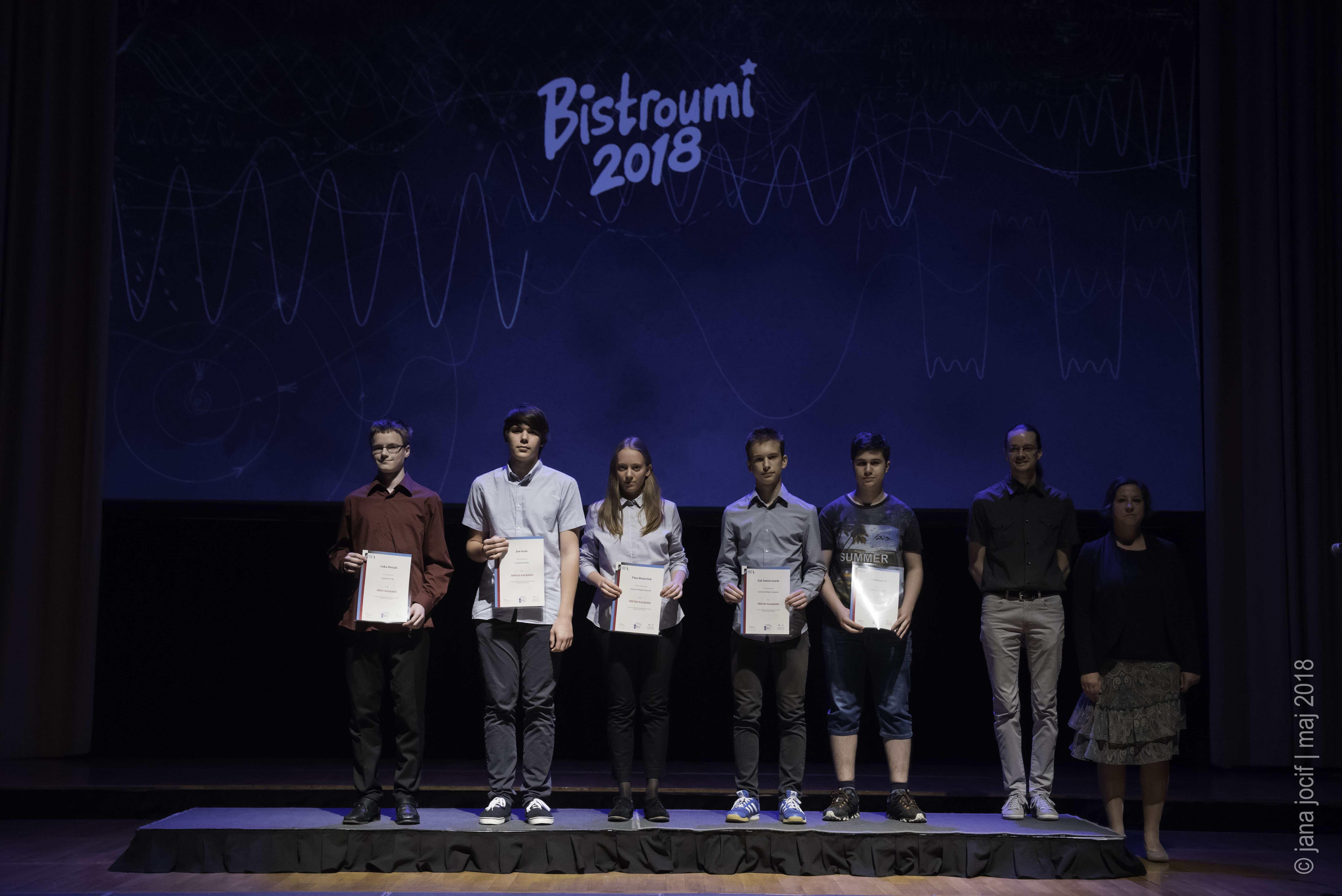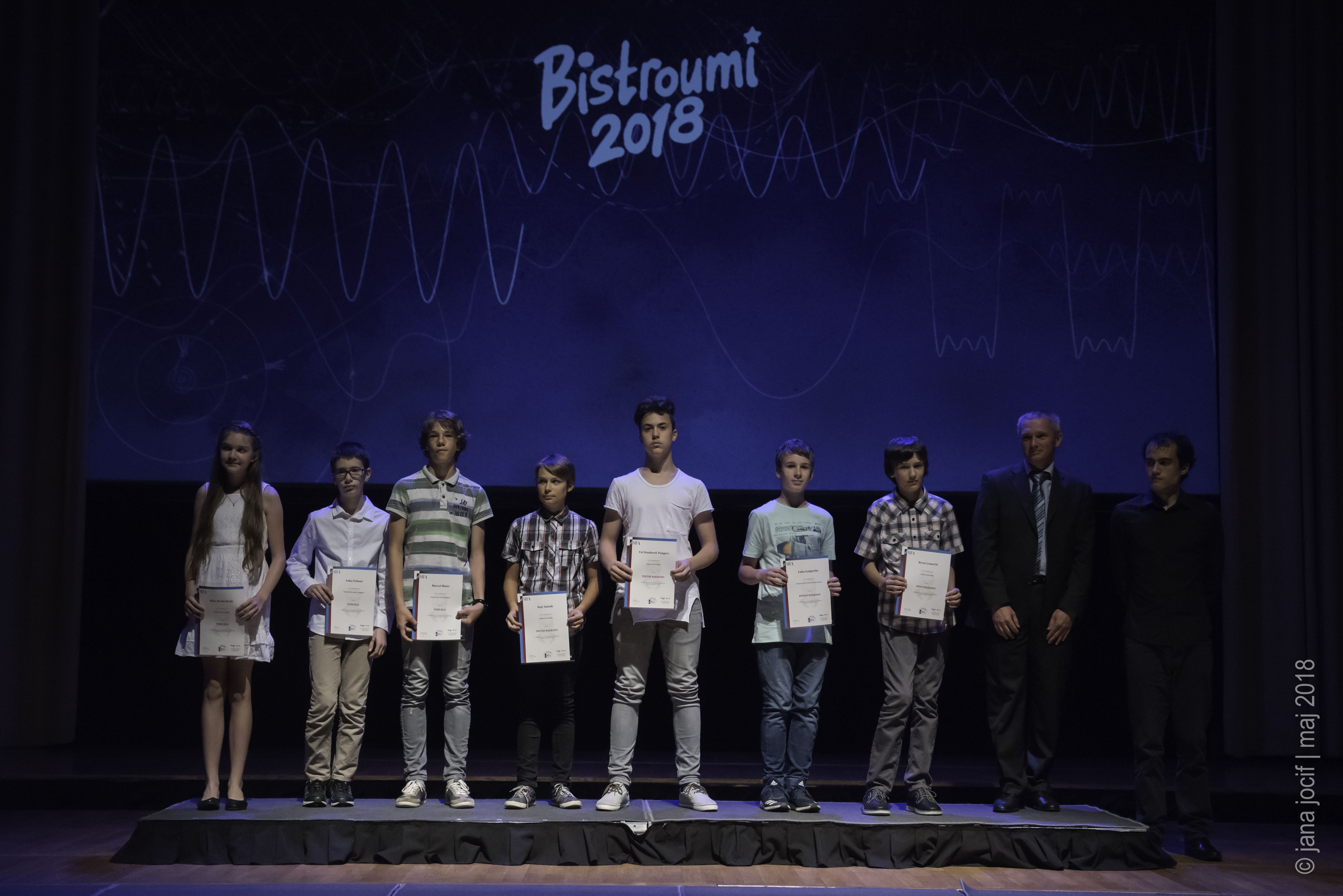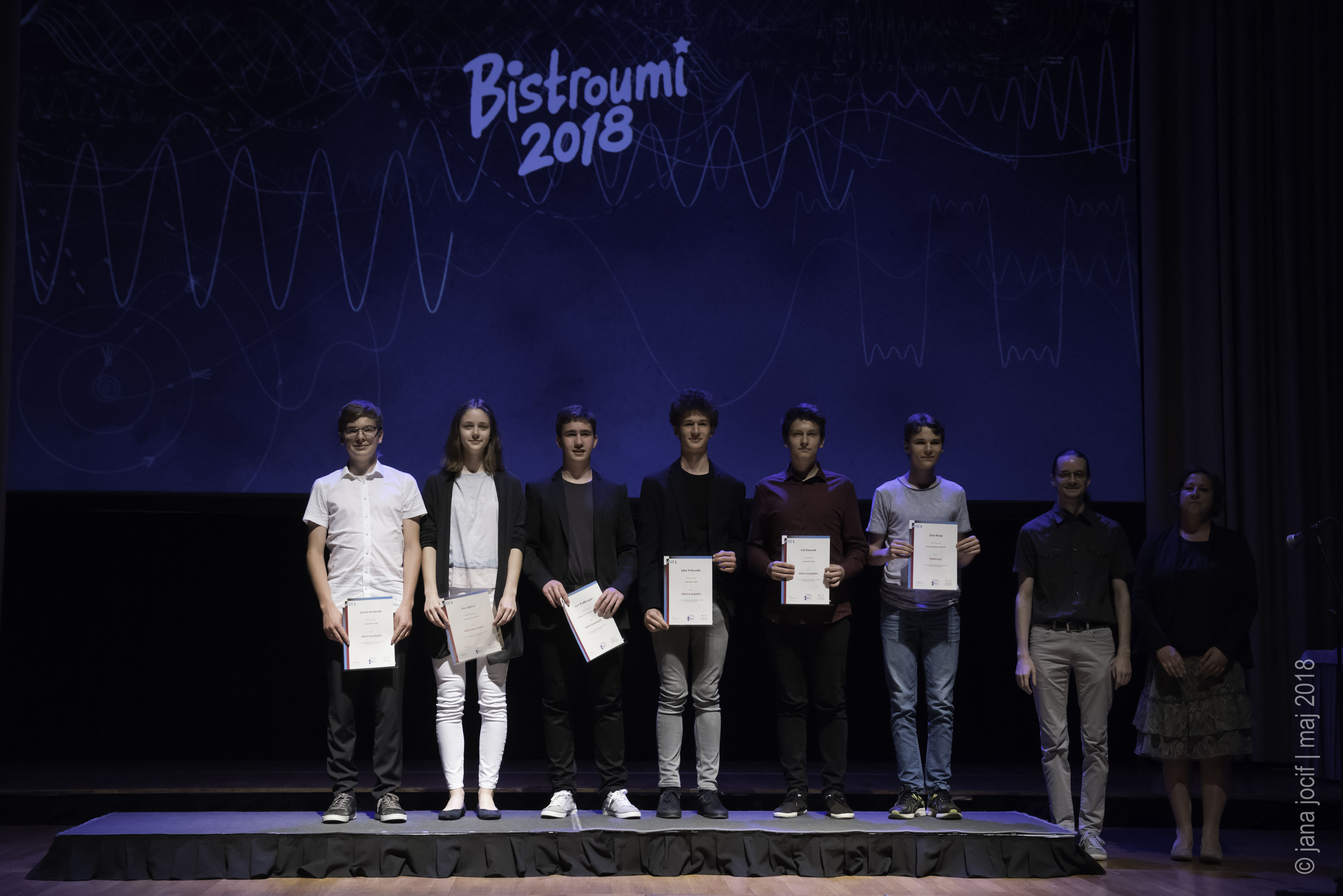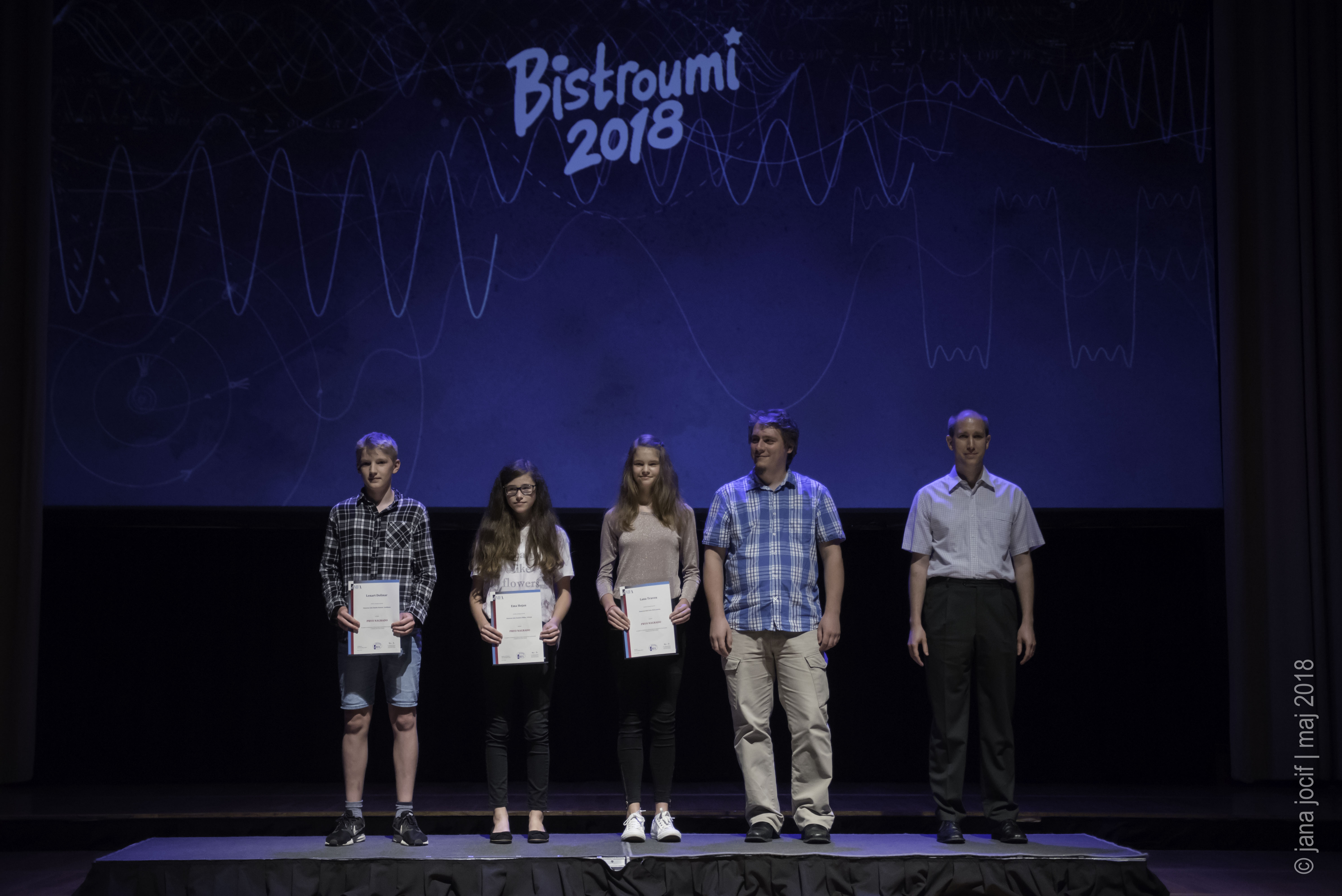 DMFA Slovenije dovoljuje shranitev slik v elektronski obliki in uporabo v individualne namene nagrajenih tekmovalcev. Uporaba posameznih slik na spletnih straneh šol ali v šolskih publikacijah je dovoljena, navesti je potrebno vir slik s povezavo na spletno stran DMFA Slovenije: <a href="http://www.dmfa.si/" title="DMFA Slovenije">www.dmfa.si</a>. Avtor slik: Jana Jocif.