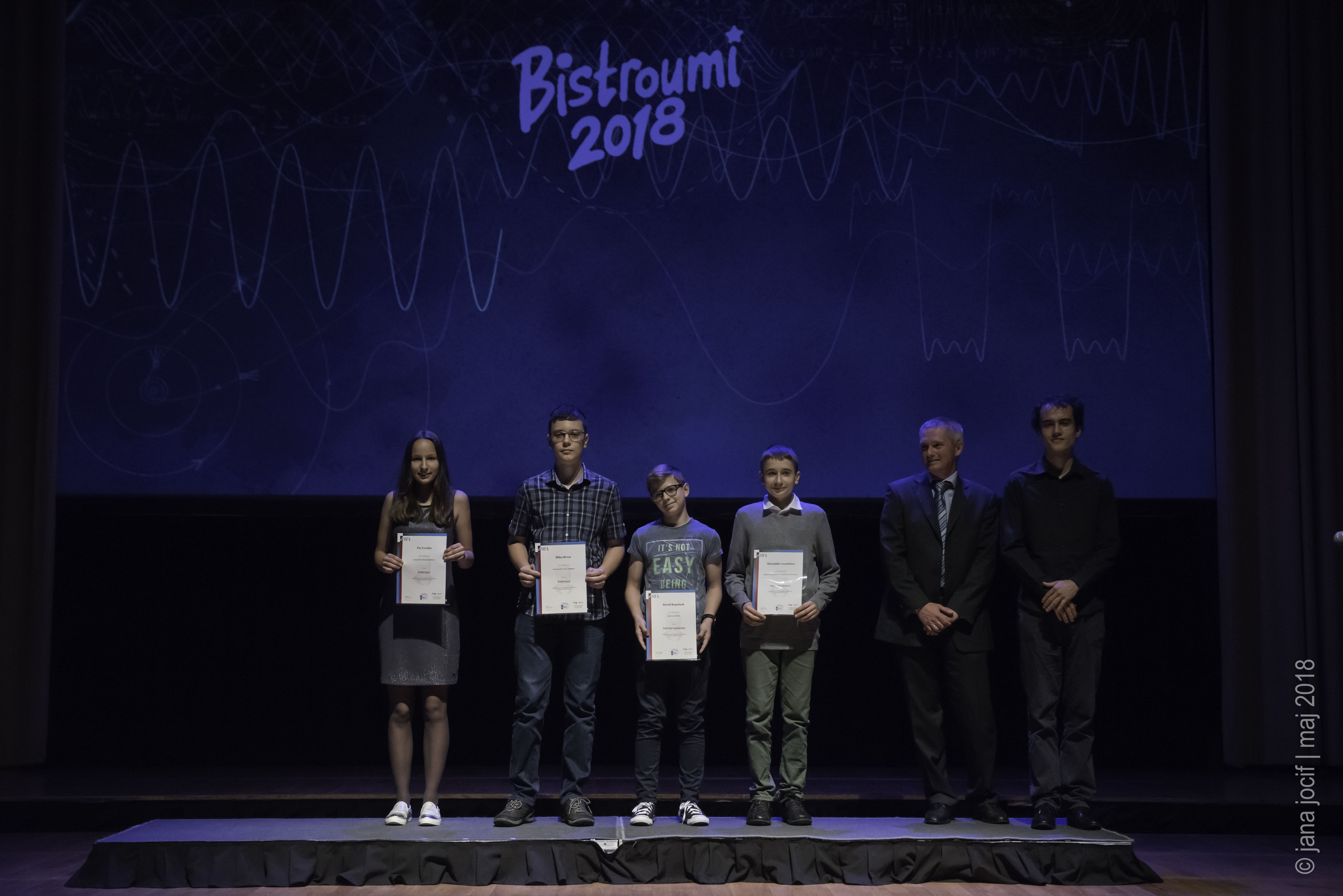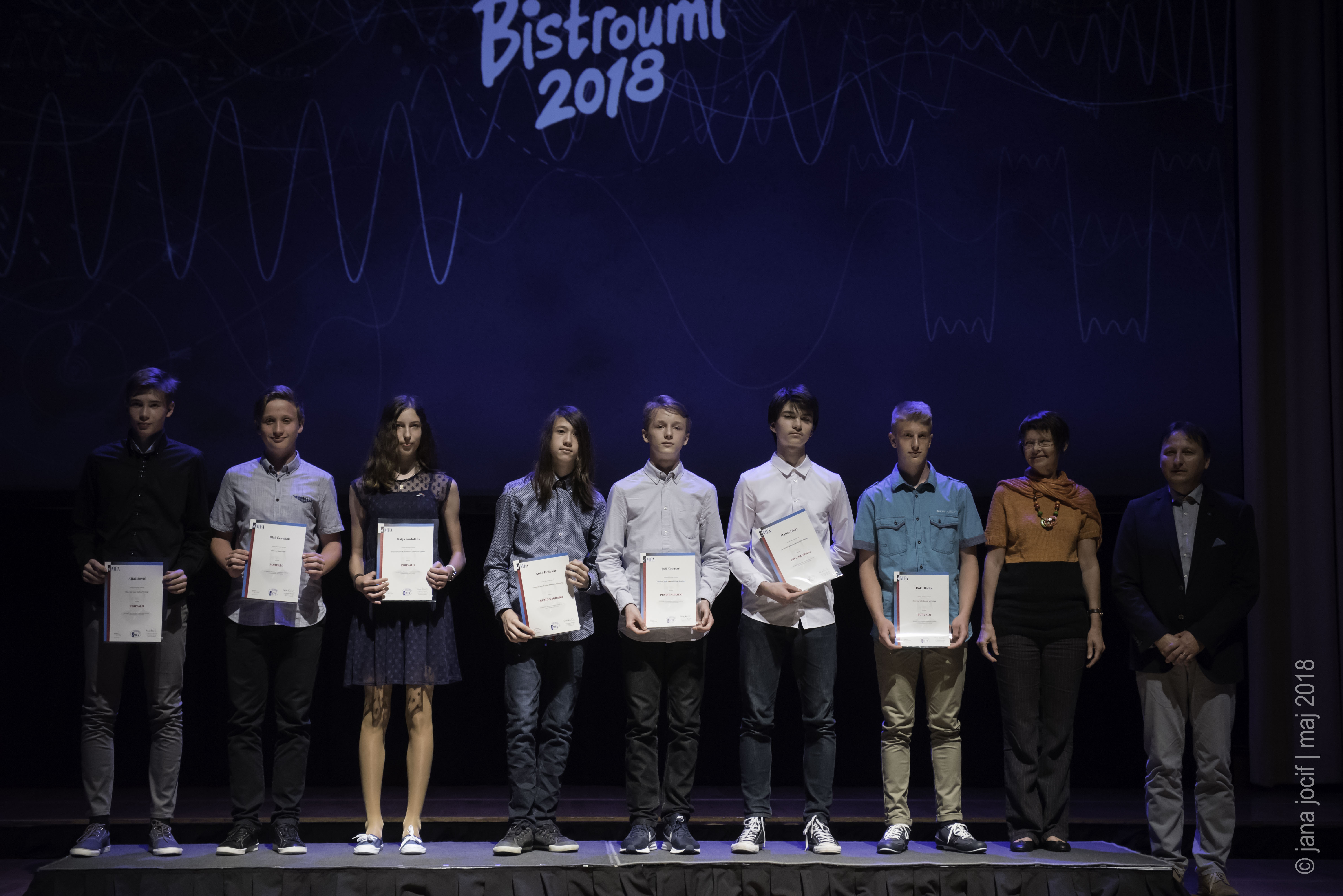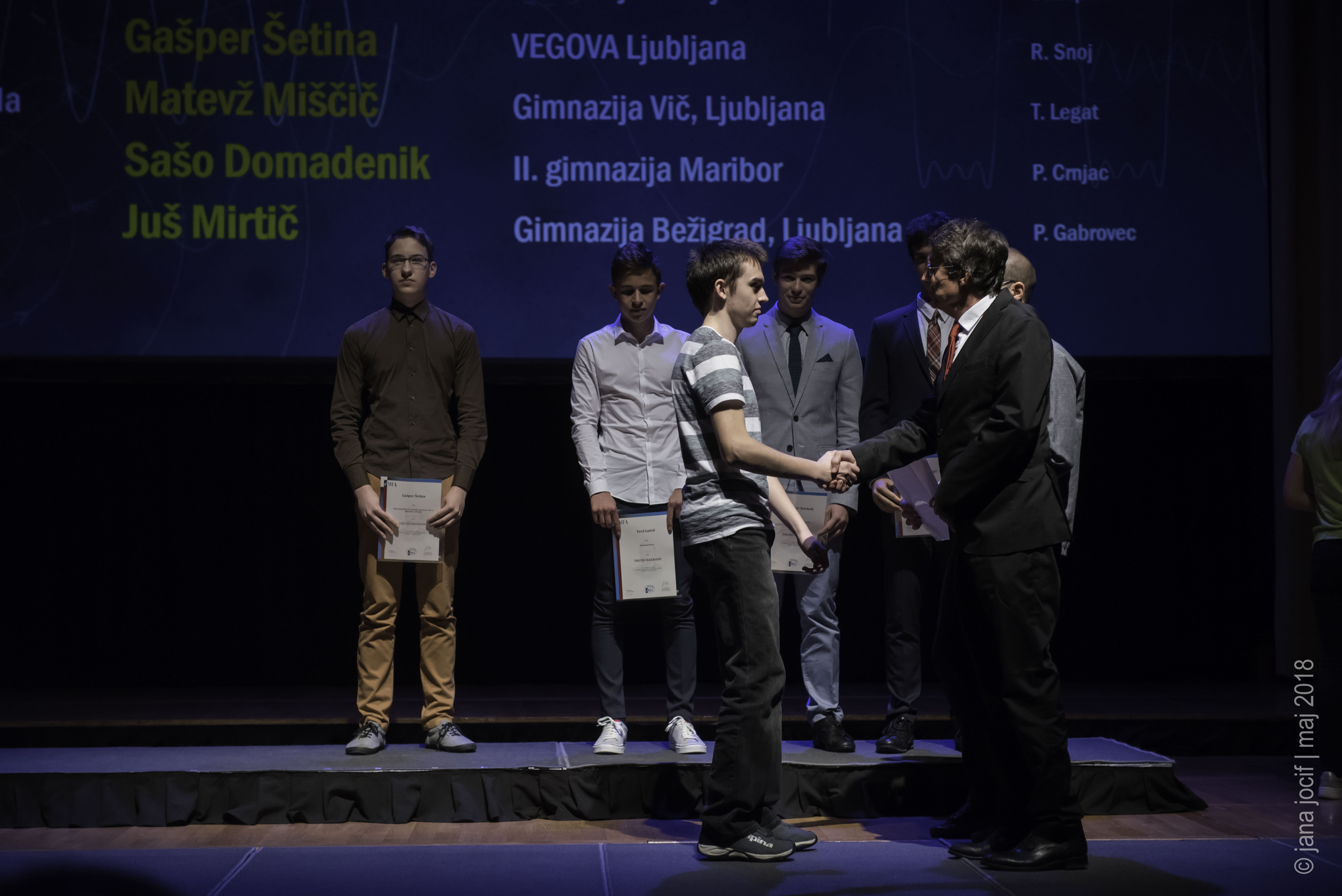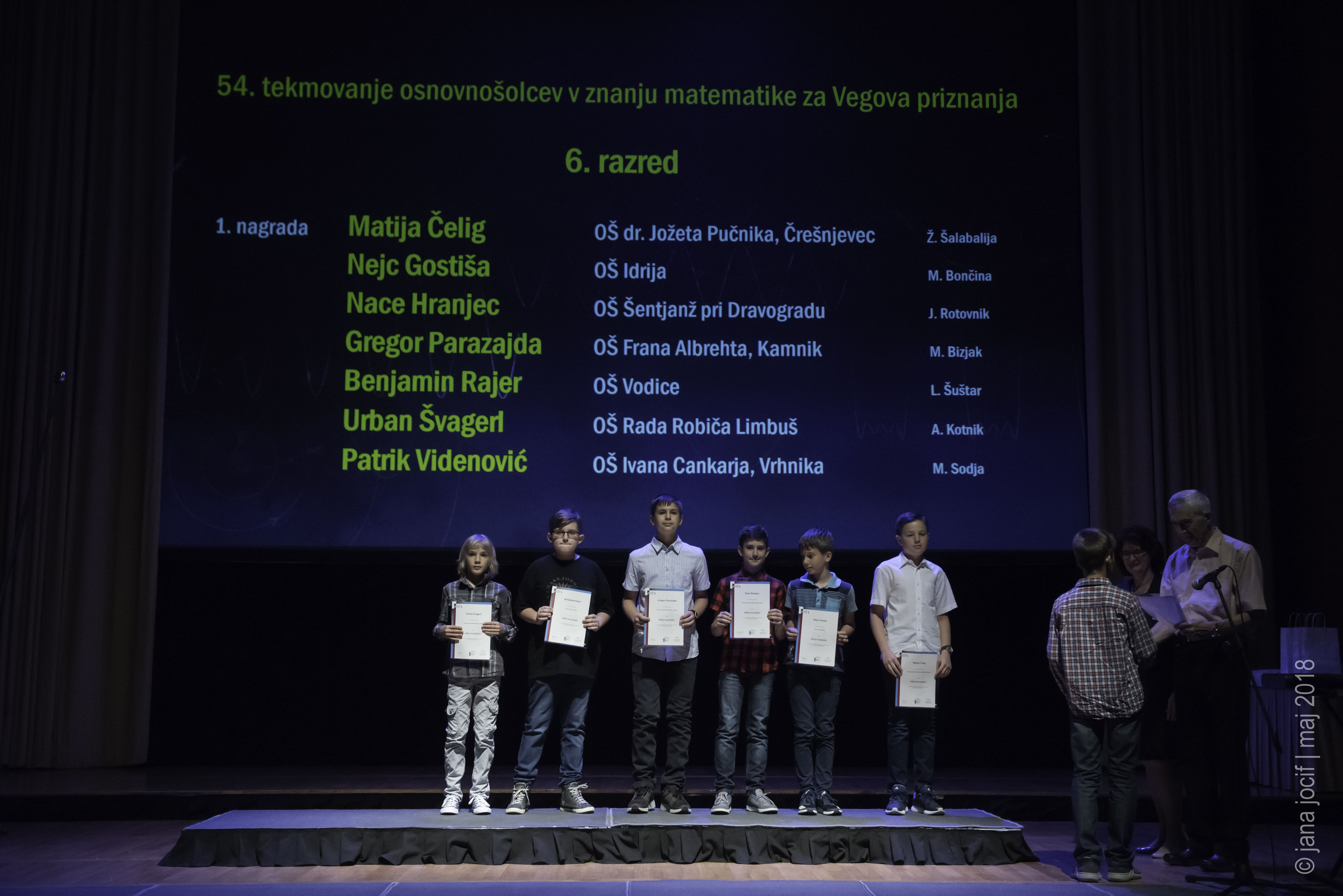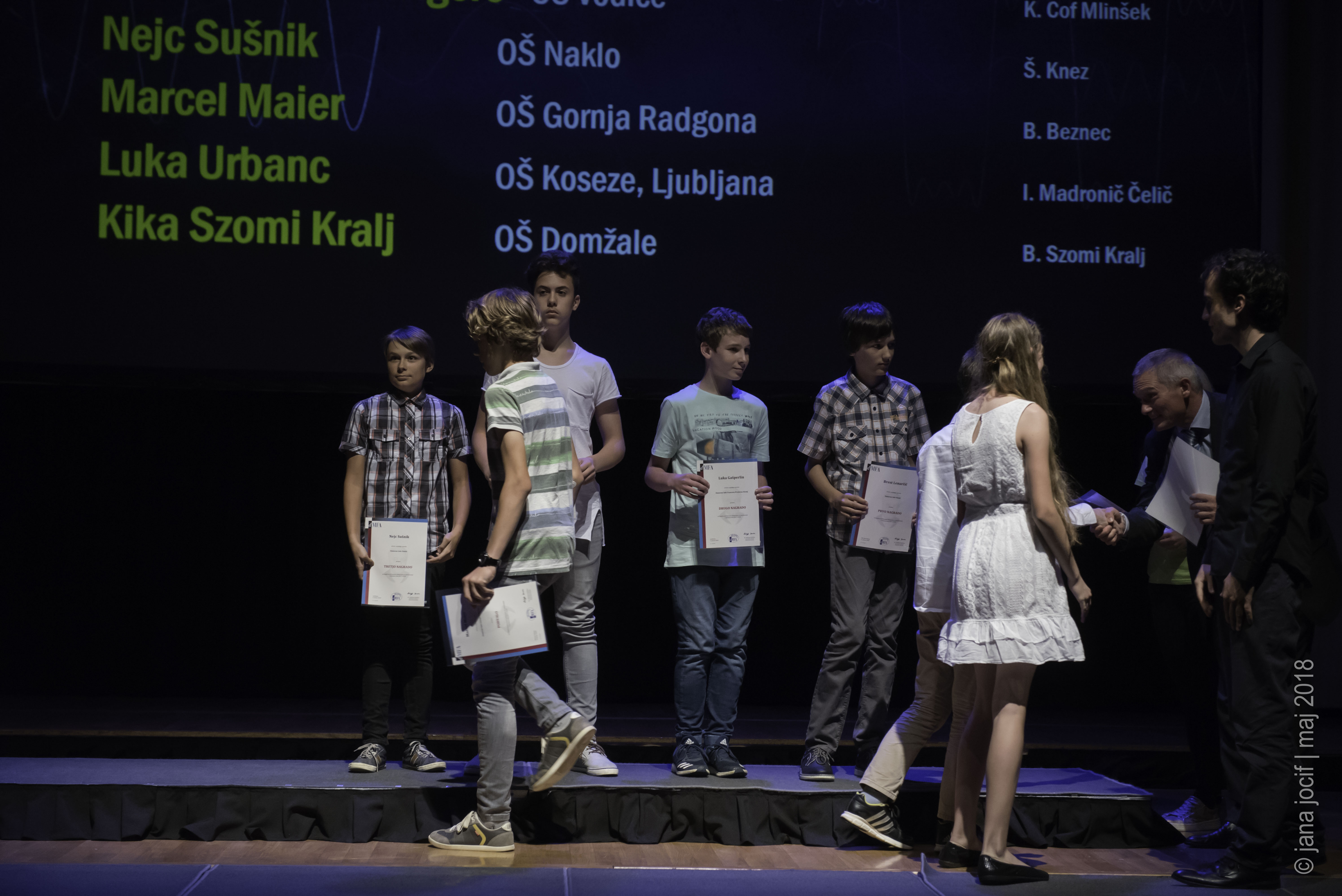 DMFA Slovenije dovoljuje shranitev slik v elektronski obliki in uporabo v individualne namene nagrajenih tekmovalcev. Uporaba posameznih slik na spletnih straneh šol ali v šolskih publikacijah je dovoljena, navesti je potrebno vir slik s povezavo na spletno stran DMFA Slovenije: <a href="http://www.dmfa.si/" title="DMFA Slovenije">www.dmfa.si</a>. Avtor slik: Jana Jocif.