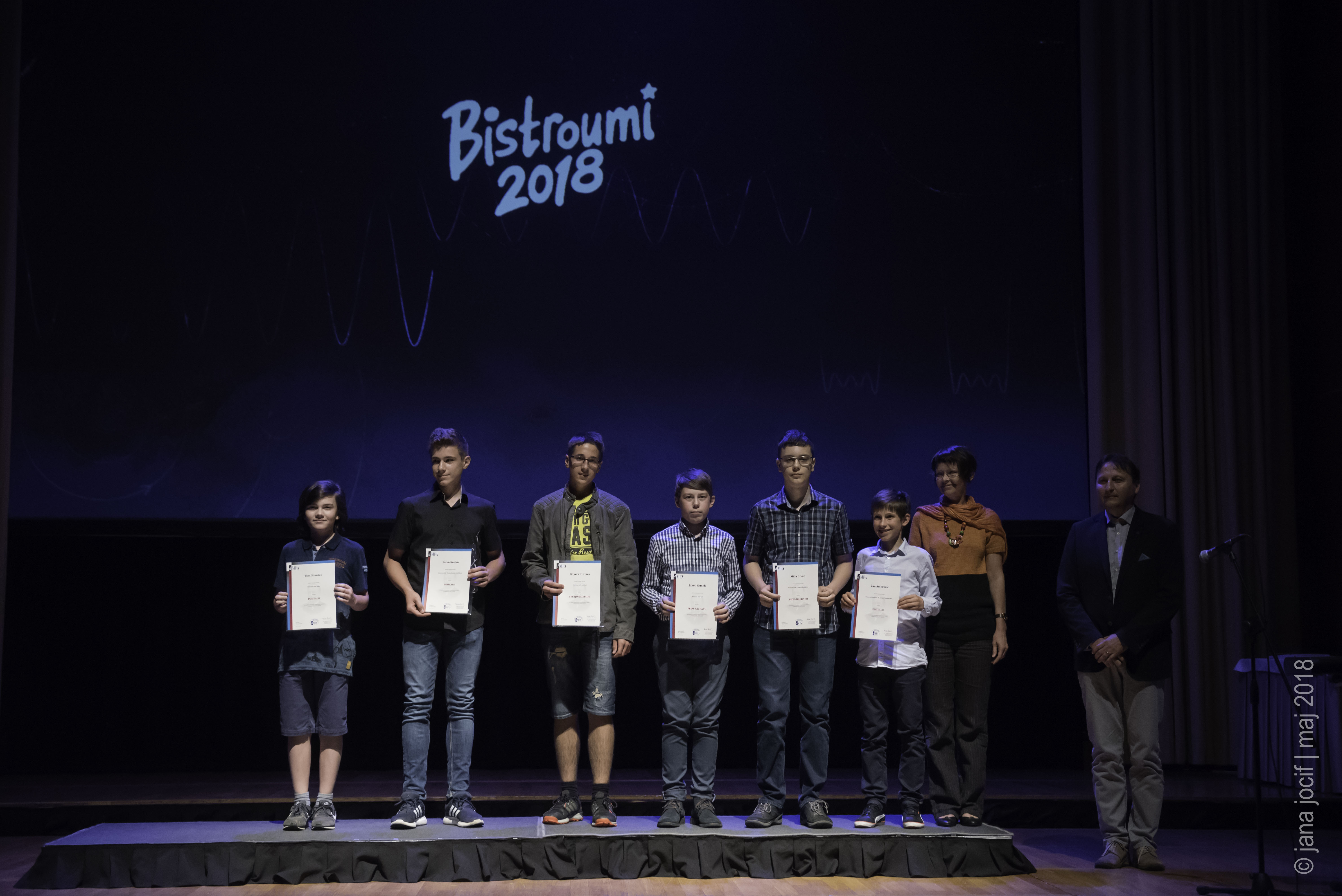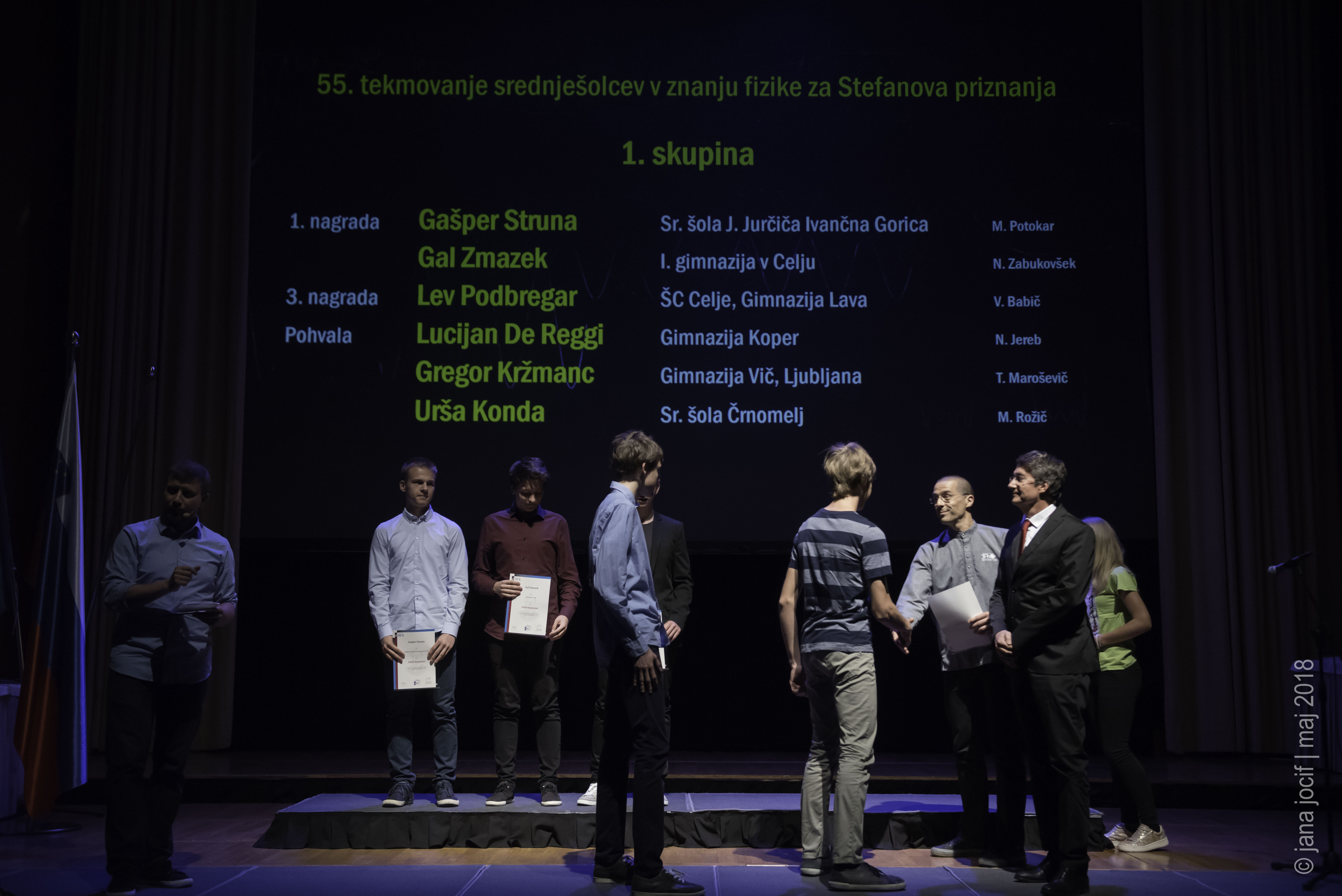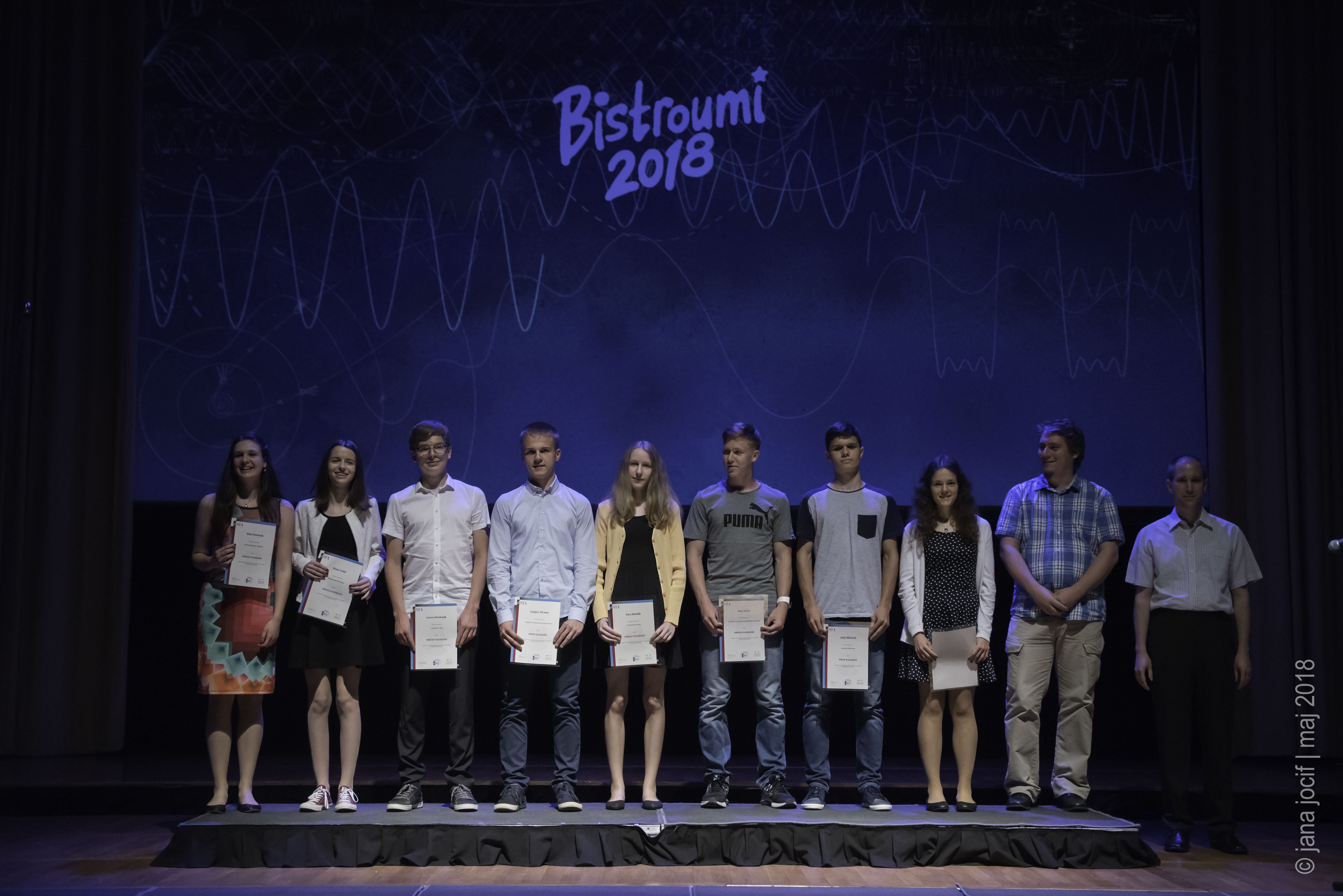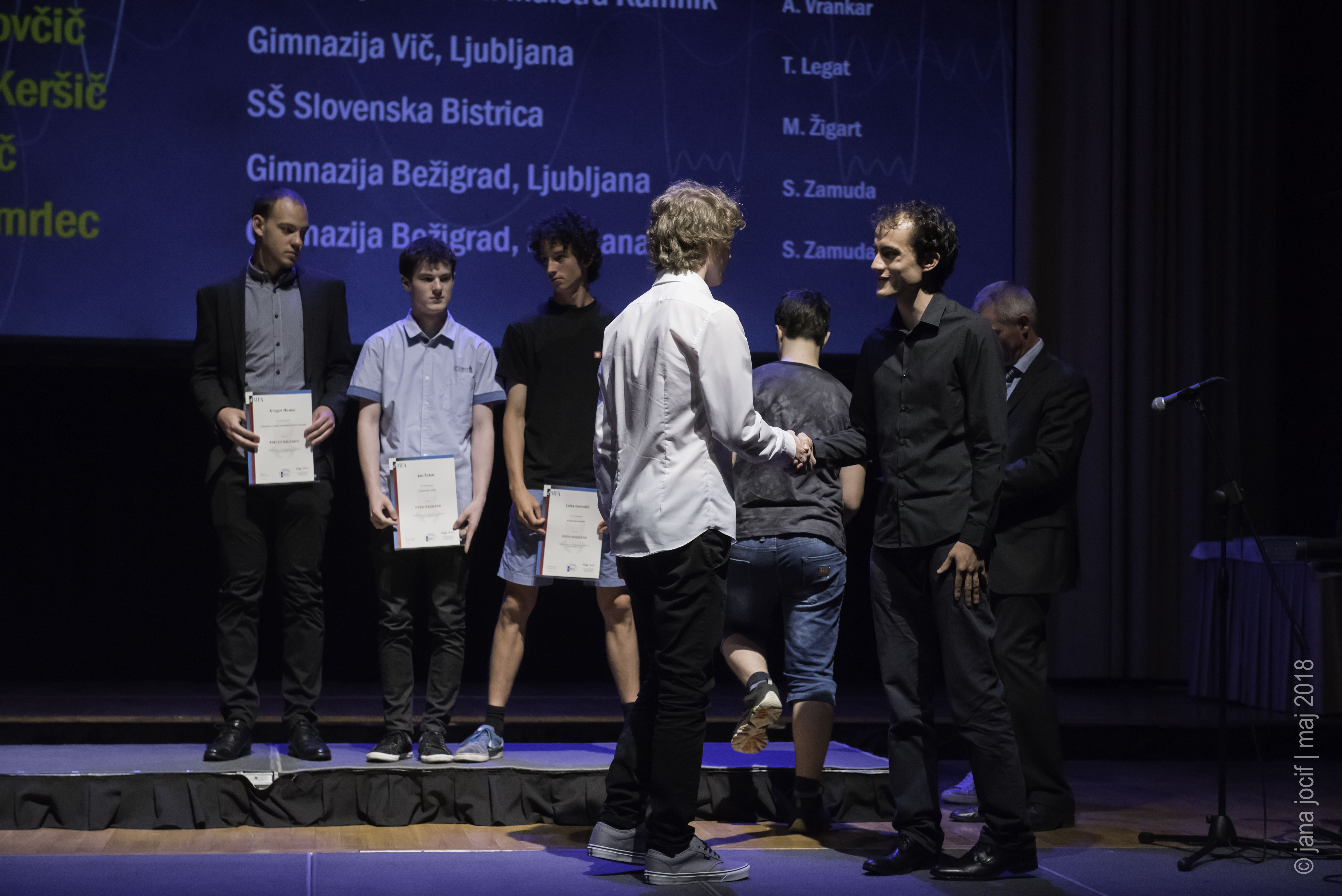 DMFA Slovenije dovoljuje shranitev slik v elektronski obliki in uporabo v individualne namene nagrajenih tekmovalcev. Uporaba posameznih slik na spletnih straneh šol ali v šolskih publikacijah je dovoljena, navesti je potrebno vir slik s povezavo na spletno stran DMFA Slovenije: <a href="http://www.dmfa.si/" title="DMFA Slovenije">www.dmfa.si</a>. Avtor slik: Jana Jocif.